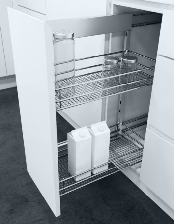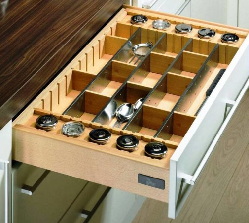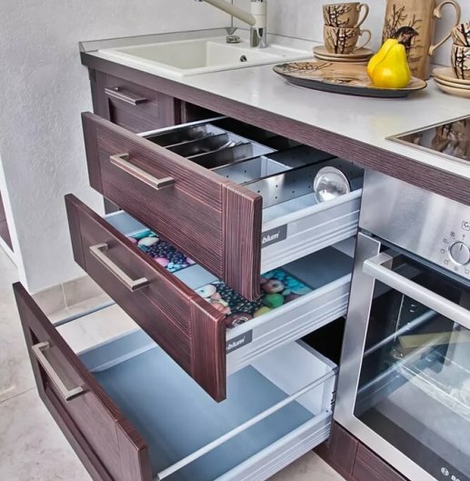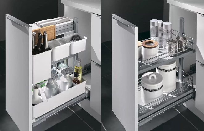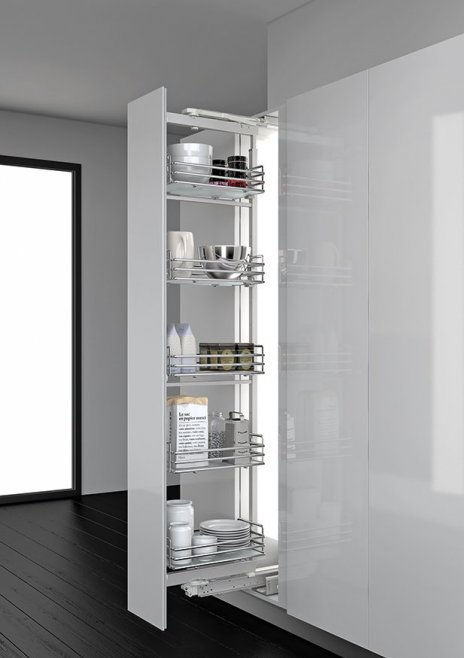 Ну и на конец что может предавать целостность всему комплексу частей из которых состоит кухня - конечно это опции заключенные в разнообразии фурнитуры , различных механизмов и специальные технологичные элементы. Не считая всю встраиваемую технику для работы на кухне.